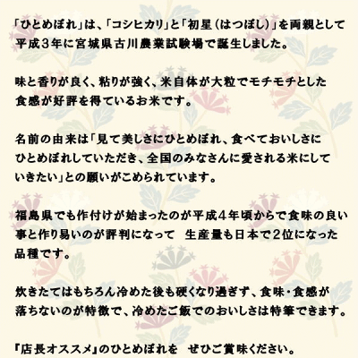 ひとめぼれは味と香りが良く、粘りが強く、米自体が大粒でモチモチとした食感が好評を得ているお米です。